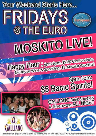 Friday @ European Bier Café 16.03: St Pats Weekend: Moskito St. Patrick's Day Weekend $4 pints of Guinness Fri, Sat & Sun European Bier Café, CBD, Thu Mar 15 02:53:42 2007